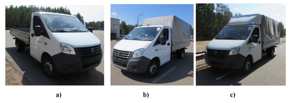 Дорожные испытания были выполнены специалистами НГТУ совместно с инженерами Горьковского автозавода при финансовой поддержке Минобрнауки России в рамках проекта «Создание высокотехнологичного производства модельного ряда автомобилей ГАЗель Next с новой электронной архитектурой электронных систем» по Соглашению № 075-11-2019-027 от 29.11.2019 г. (постановление Правительства Российской Федерации от 09 апреля 2010 года № 218). Испытания проходили три варианта автомобиля (рис. 1): с грузовой платформой (вариант № 1), с тентом (вариант № 2), с тентом и обтекателем (вариант № 3).