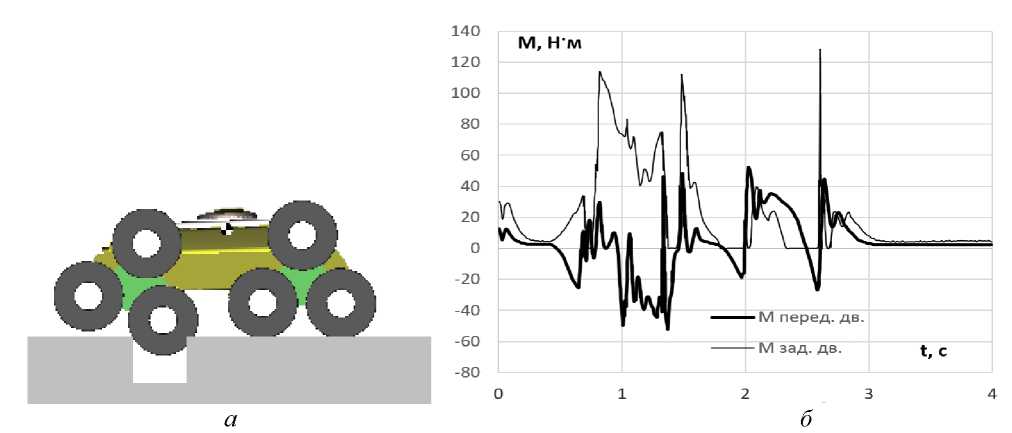 Fig. 6. Overcoming the drain: а – simulation of overcoming the drain with rear propulsions; б – moments at the input to the onboard gearboxes of the propulsions of the robot’s left side