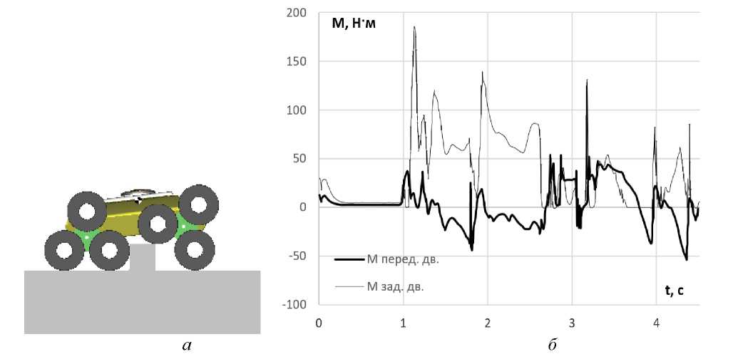 Рис. 7. Преодоление бордюра: а – моделирование преодоления бордюра; б – моменты на входе в бортовые редукторы движителей левого борта робота