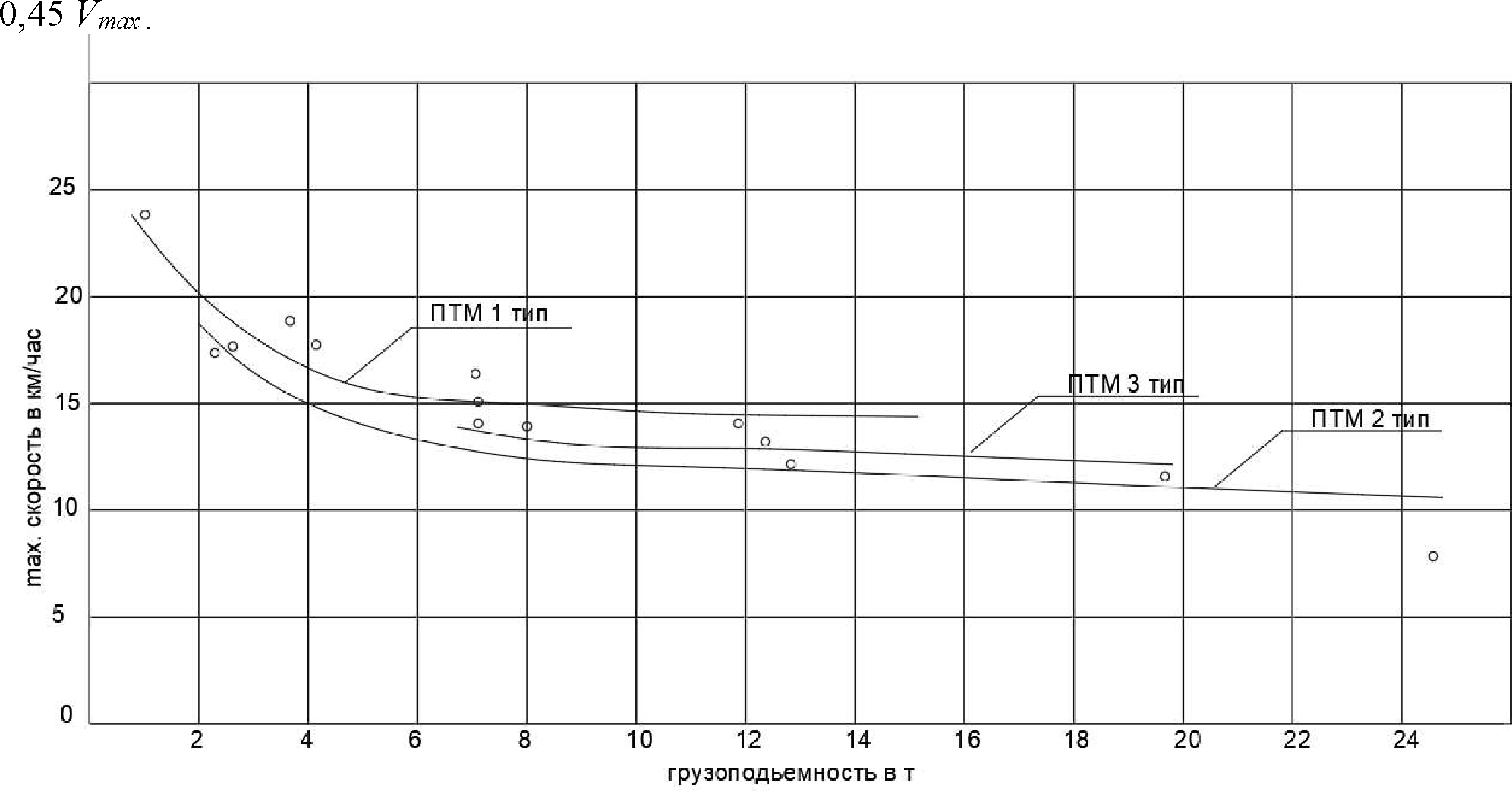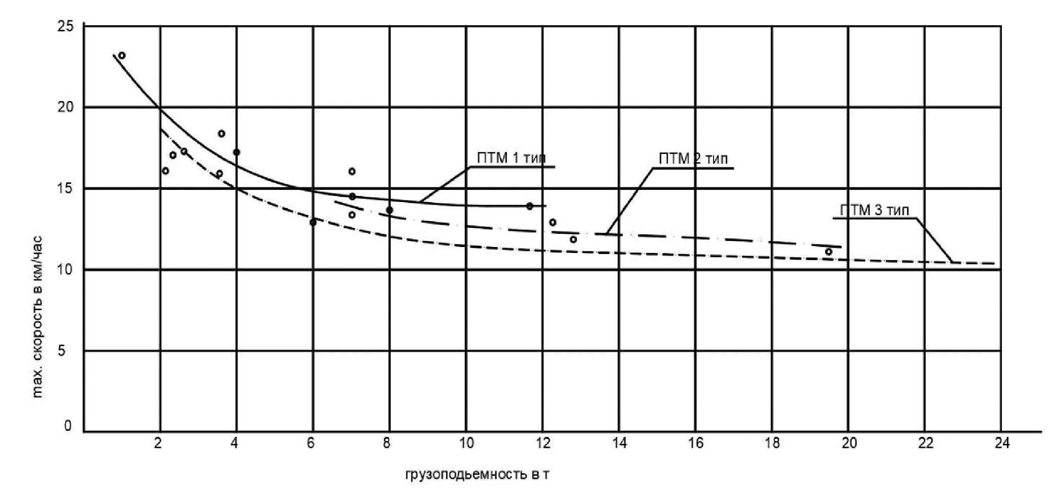 Выразим функциональную зависимость для указанных типов ПТМ графически (рис. 5), пользуясь данными максимальных скоростей движения, полученными при испытаниях [1, 4], а также исходя из технических характеристик ПТМ [5, 2, 15].