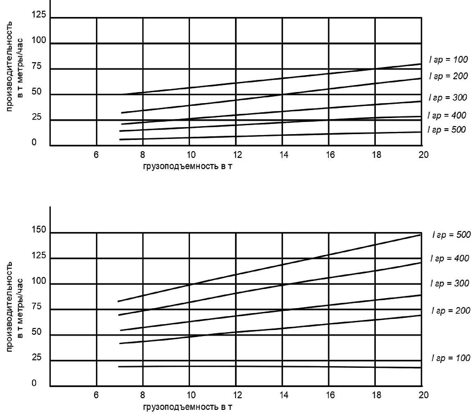 в) наиболее существенное изменение средней технической скорости (1 км/час на 1 т) наблюдается у погрузочно-транспортных машин малой и средней грузоподъемности (до 6-7 т), тогда как при дальнейшем повышении грузоподъемности (с 7 до 27 т средняя техническая скорость изменяется весьма незначительно (0,25 км/час на 1 т).