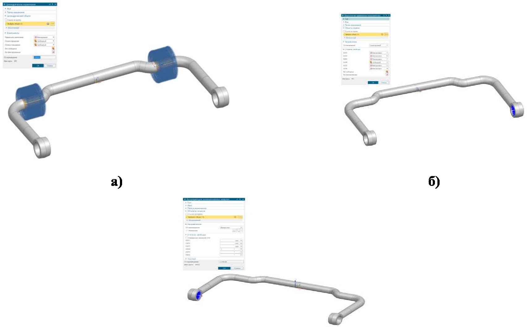 Рис. 3. Граничные условия: а) резинометаллический шарнир; б) ограничение по всем степеням свободы, кроме вращения вокруг оси Х; в) вращательное кинематическое воздействие относительно оси Х на 1º