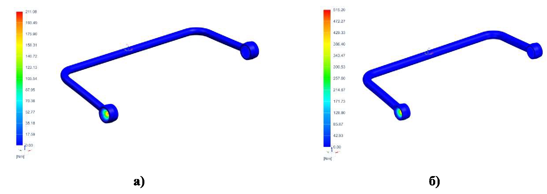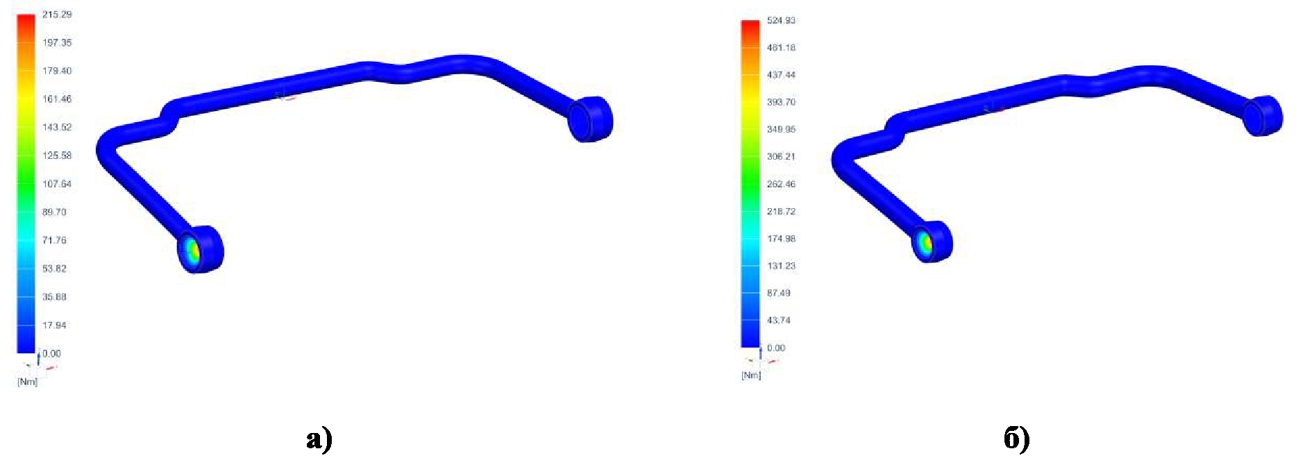 Рис. 5. Распределение моментов реакций для стабилизатора поперечной устойчивости сложной геометрической формы: а) стабилизатор dсб =36 мм; б) стабилизатор dсб = 45 мм
