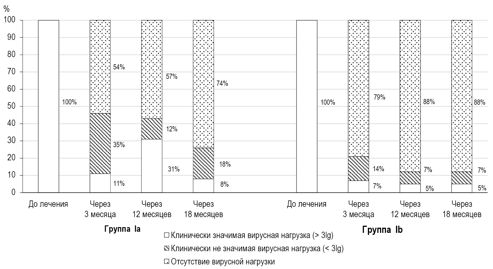 Через 3 мес в группе Iа снижение вирусной нагрузки зафиксировано у 35% пациенток и у 54% вирус не определялся, то есть общая эффективность лечения составила 88%, в то время как в группе Iб (с применением противовирусной терапии) у 14% пациенток вирусная нагрузка была ниже клинически значимой, а у 79% обследованных вирус не определялся (суммарно 93%). Через 12 мес в группе Ia уменьшилось число пациенток, у которых отмечено снижение вирусной нагрузки (12%), а отрицательным тест был у 57% (суммарный показатель 69%). В группе Iб у 7% пациенток диагностировано снижение вирусной нагрузки ниже клинически значимой и у 88% не выявлено ВПЧ (суммарно 95%) через 12 и 18 мес. У пациенток группы Ia, в мазках у которых сохранялась цервикальная интраэпителиальная неоплазия, на фоне прведённой повторной эксцизии суммарная эффективность лечения составила через 18 мес 92% (рис. 1).