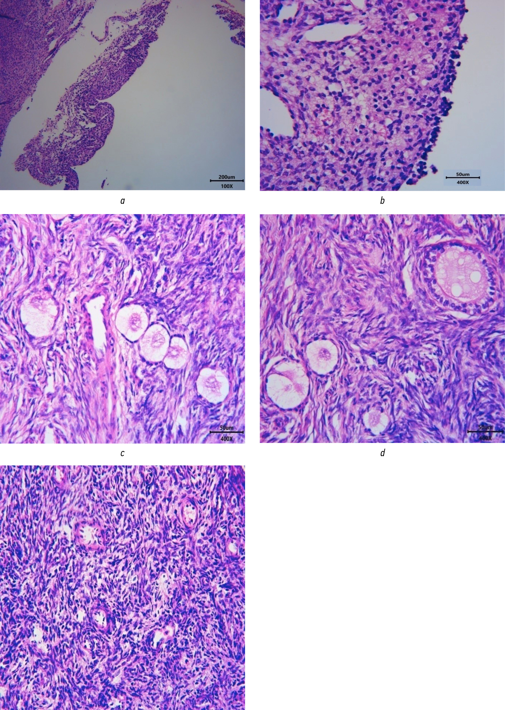 Fig. 4. Microscopic examination of the ovarian biopsy: a, b ― several large follicular cysts lined with granulosa cells with dystrophic changes; c ― cystic-atresized follicles, some with signs of dystrophy and calcification; d, e ― hypercellularity and numerous vessels of the stroma.