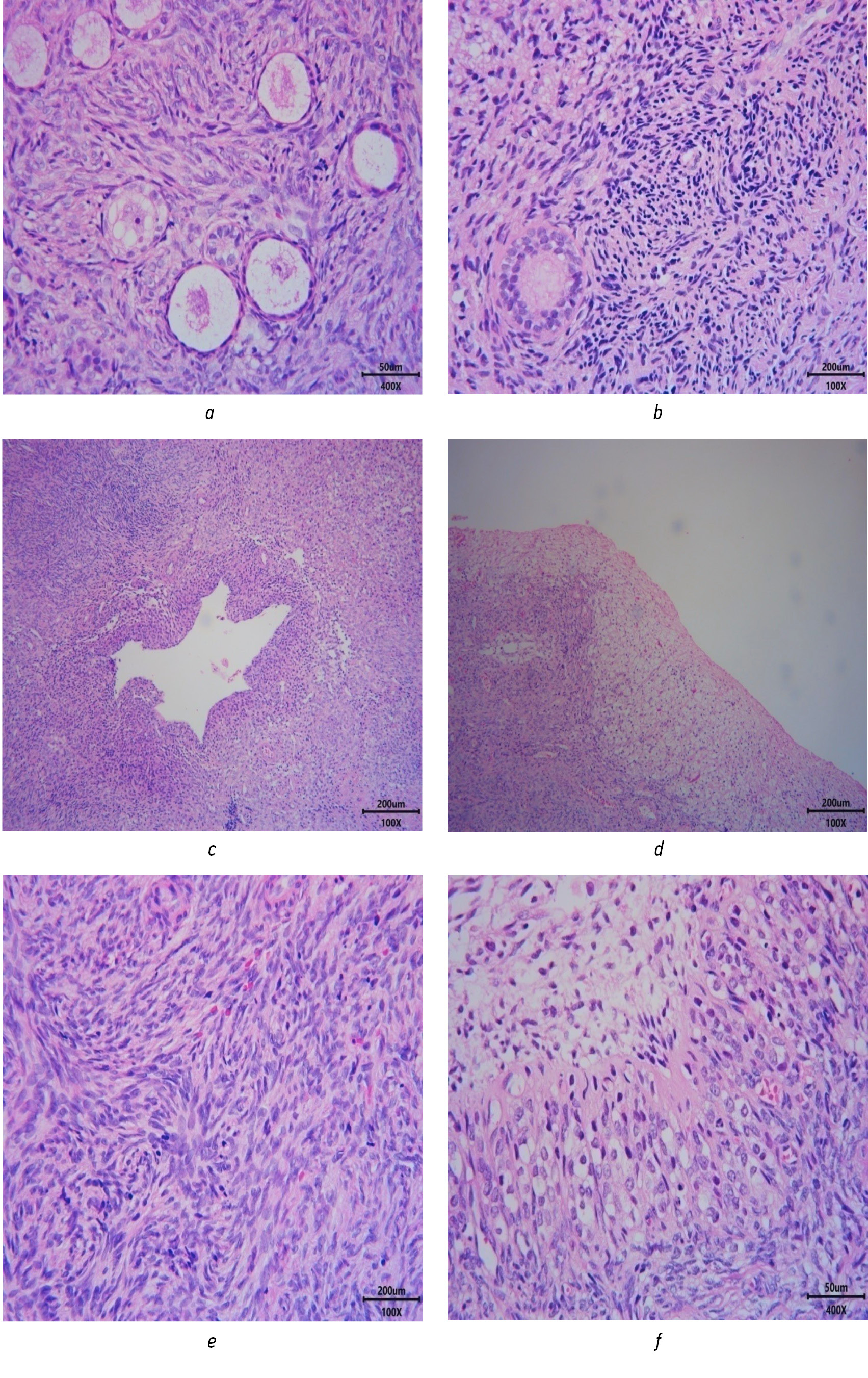 Fig. 5. Microscopic examination of the ovarian biopsy: a, b ― numerous primordial follicles are detected; c ― cystic-atresized follicle lined with granulose cells in several layers; d ― yellow body; e, f ― stroma fibrosis.