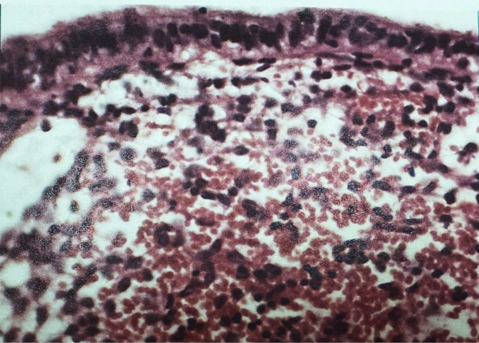 Отмечалось повышение проницаемости стенок микрососудов, а также повышение гидростатического, осмотического и онкотического давления в слизистой оболочке матки. Замедление кровотока в расширенных кровеносных сосудах сопровождалось нарушением реологических свойств крови с краевым стоянием лейкоцитов к эпителиоцитам капилляров и выходом лейкоцитов в окружающие ткани. При резком повышении давления в микроциркуляторном русле уже отмечался выход эритроцитов за пределы кровеносных сосудов (диапедез). В результате усиленная экссудация жидкой части крови и эмиграция лейкоцитов в слизистую оболочку матки способствовали отёку гистоструктур матки. Таким образом, в фазе экссудации формировался бесклеточный экссудат, а также клеточный экссудат воспалительного процесса слизистой оболочки матки (рис. 4).