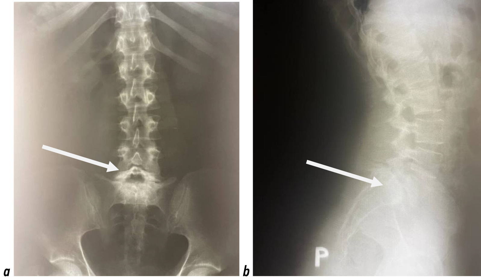 Fig. 1. X-ray of the lumbosacral spine of patient F. before neurosurgical operation: а ― frontalis projection; b ― sagittalis projection. Spondylolysis spondylolisthesis of the L5 vertebra is indicated by an arrow.