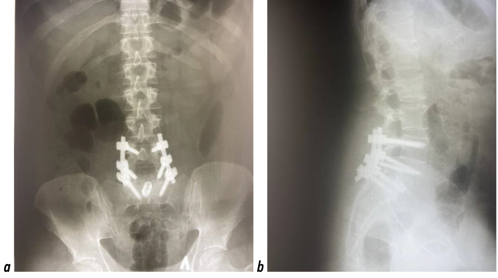 Рис. 2. Рентгенограмма пояснично-крестцового отдела позвоночника пациентки Ф. после операции: а ― фронтальная проекция; b ― сагиттальная проекция