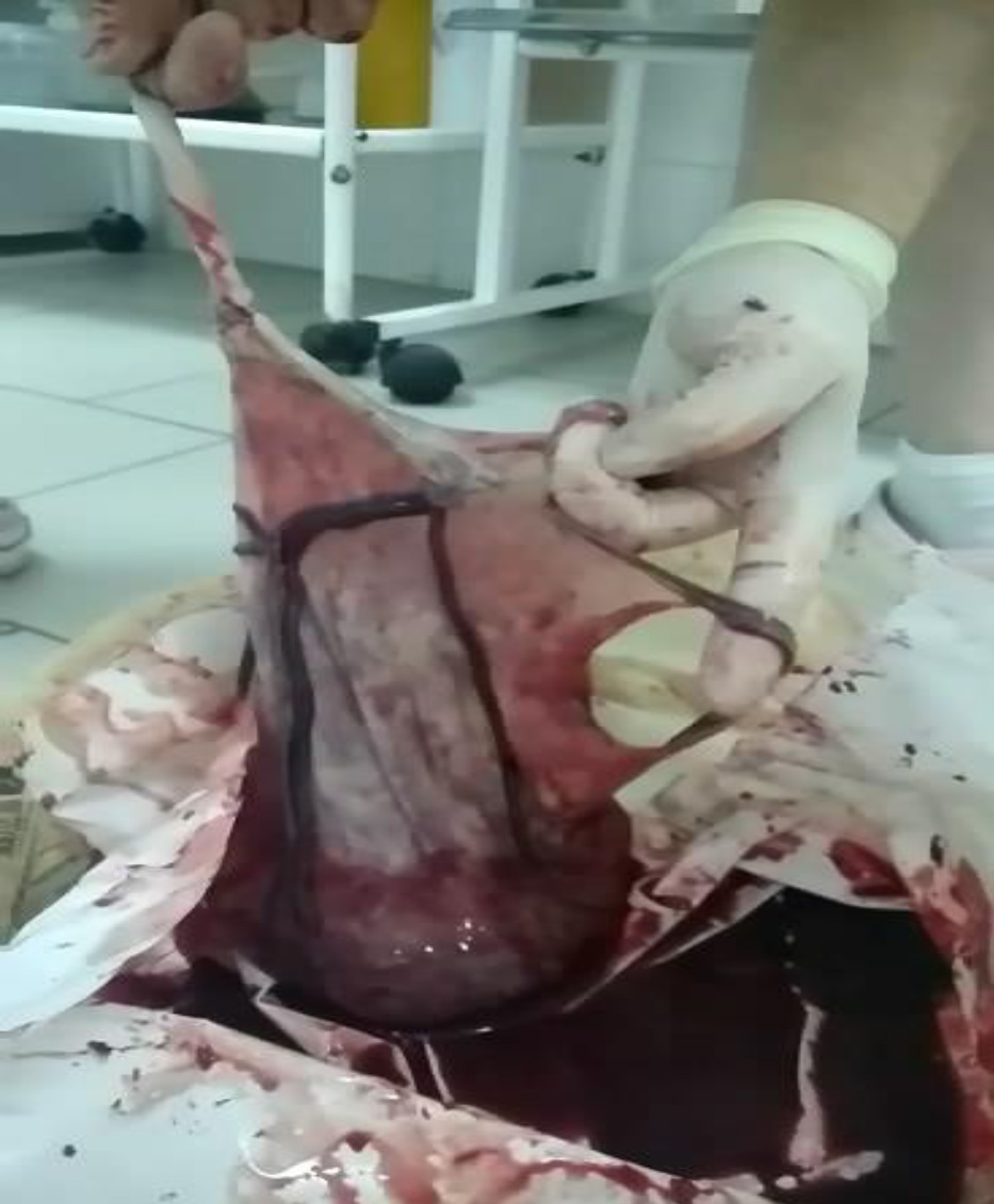 Операцию выполняли под спинномозговой анестезией, поперечным надлобковым разрезом послойно вскрыли брюшную полость. Матка вскрыта поперечным разрезом в нижнем сегменте. Извлечён ребёнок мужского пола, с однократным нетугим обвитием пуповины вокруг шеи. Оценка по шкале Апгар 6–7 баллов. Масса 2030 г, длина тела 45 см. Послед размерами 16 × 18 × 2,0 см, массой 490 г, с оболочечным прикреплением пуповины. Кровопотеря составила 415 мл. Послеоперационный период протекал без осложнений. Пациентка выписана домой на 6-е сутки после операции. Патогистологическое исследование последа: оболочечное прикрепление пуповины; единичные ложные узлы пуповины (рис. 1, 2).