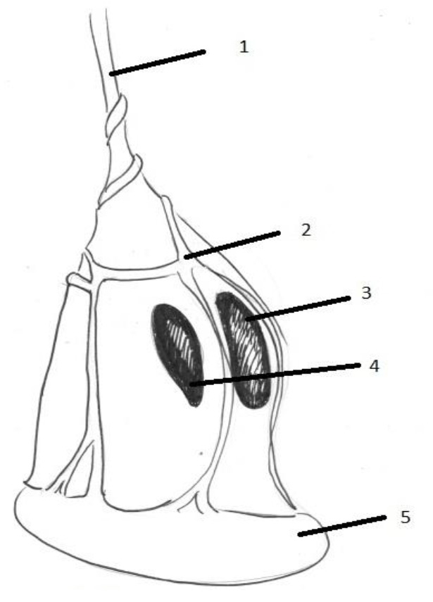 Рис. 2. Схематичное изображение последа при предлежании сосудов пуповины. 1 — пуповина; 2 — сосуды пуповины, расщепленно расположенные в оболочках; 3 — отверстия в оболочках после извлечения ребёнка при операции кесарева сечения; 4 — отверстие в оболочках после преждевременного разрыва плодных оболочек; 5 — плацента.