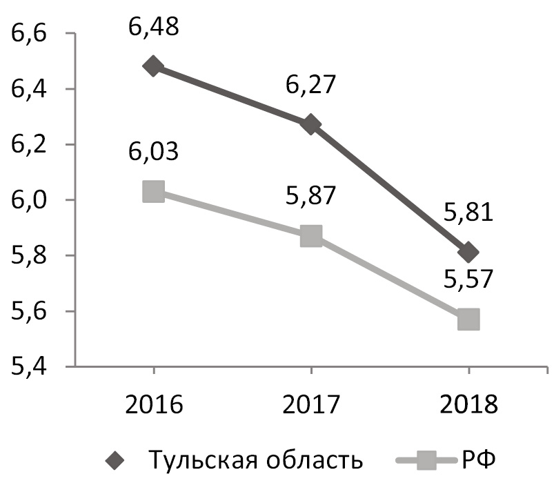 Рис. 1. Динамика мёртворождаемости по Тульской области и РФ в 2016–2018 гг. (‰).