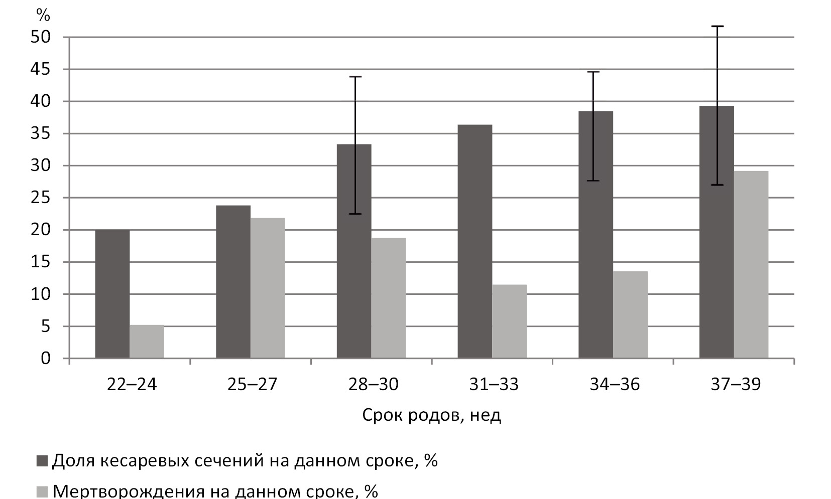 В мире отмечается беспрецедентный рост частоты операций КС, причём в последнее время (2016 г.) частота операции составляет в среднем 24,5% в Западной Европе, 32% в Северной Америке и 41% в Южной Америке [18]. В настоящем исследовании выявлена более высокая частота КС при мёртворождениях, диагностированных до родов, чем можно было бы ожидать, учитывая относительно редкие материнские состояния, которые оправдывают абдоминальное родоразрешение, и известную материнскую заболеваемость, связанную с КС. Частота операции КС по данным нашего исследования при антенатальной гибели плода составила 33,3%, что примерно в 2 раза выше, чем по данным из США (15,2%) [19] и Румынии (17,2%) [20]. В этих странах другие критерии МР (в США — вес плода 350 г и более при сроке 20 нед и более; в Румынии — срок 28 нед и более). Отмечена тенденция роста частоты хирургического родоразрешения в соответствии с увеличением срока беременности.