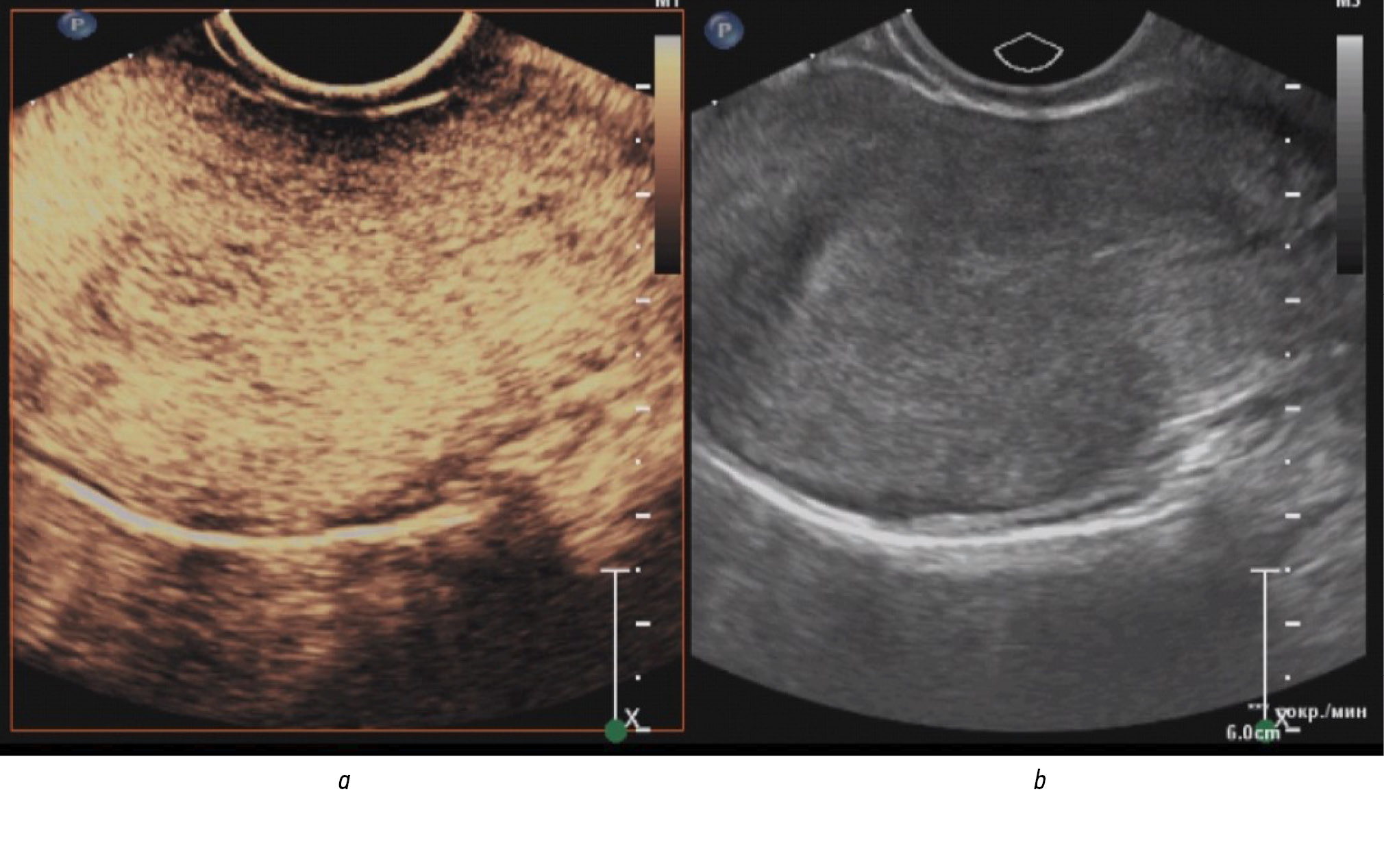 Fig. 1. Arterial phase of contrast in endometrial cancer (homogeneous iso contrast without clear contours): a ― in contrast mode; b ― in the gray scale mode.