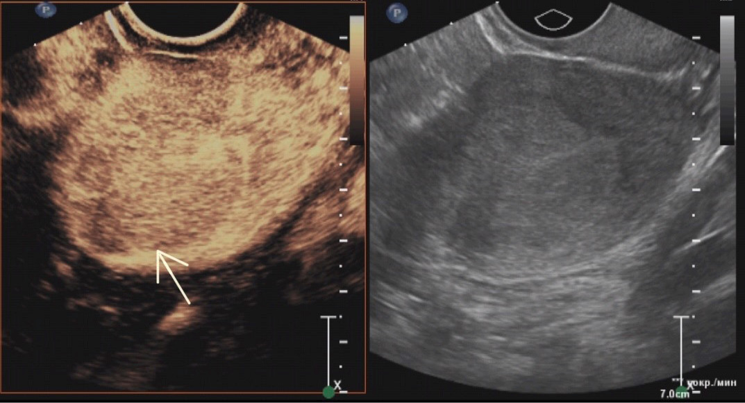 Fig. 2. Venous phase of contrast in endometrial cancer (hypocontrasting due to earlier leaching of contrast from the tumor compared to intact myometrium): a ― in contrast mode, the arrow shows the contour of the tumor; b ― in the gray scale mode.