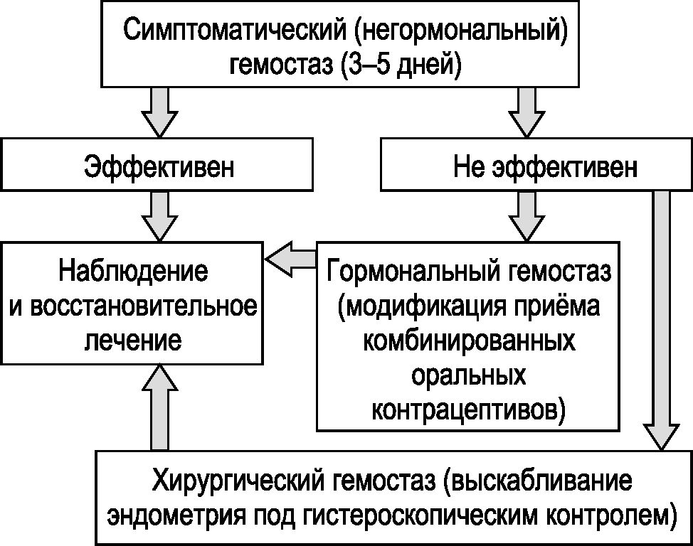 Лечение. Хирургический гемостаз (РДВ); коррекция анемии. Дальнейшая тактика в зависимости от результатов гистологического исследования соскоба эндометрия.