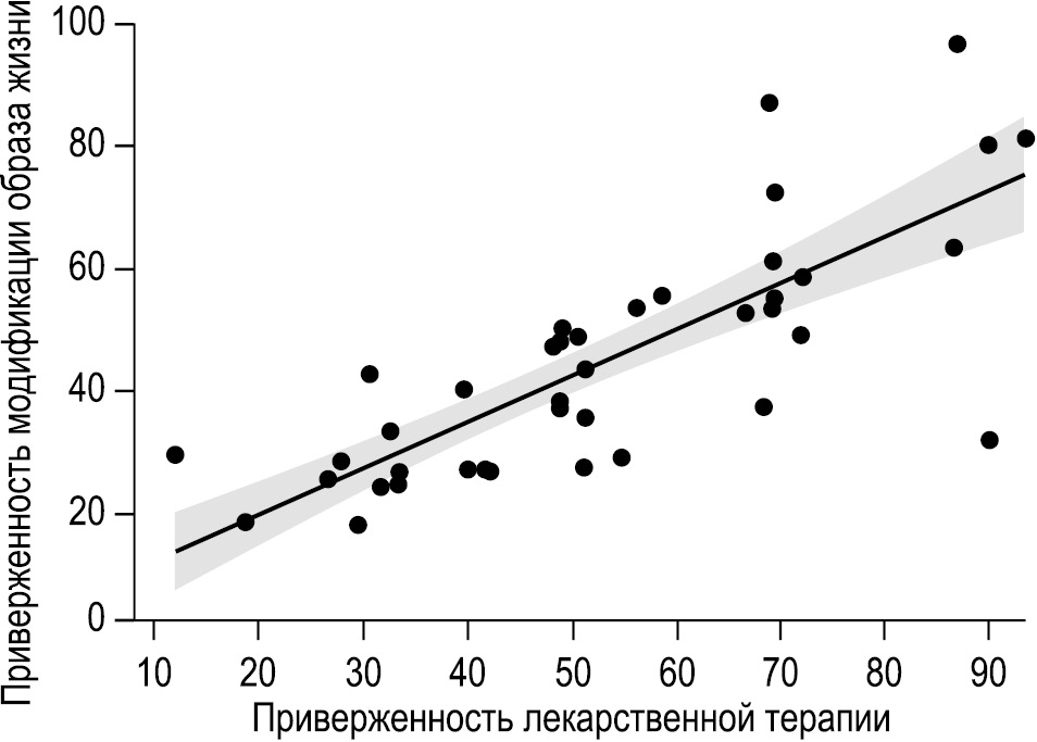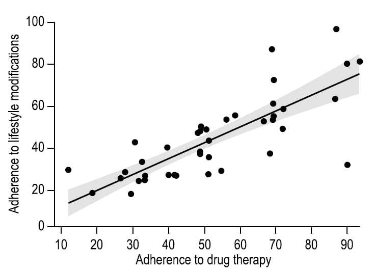 The density of the distribution of points in the figure shows the correlation between these two components: those who are more committed to drug therapy are also willing to change their lifestyle (r=0.77; p <0.001). A similar pattern was found for adherence to medical support, indicating willingness to undergo medical and diagnostic procedures (r=0.68; p <0.001).