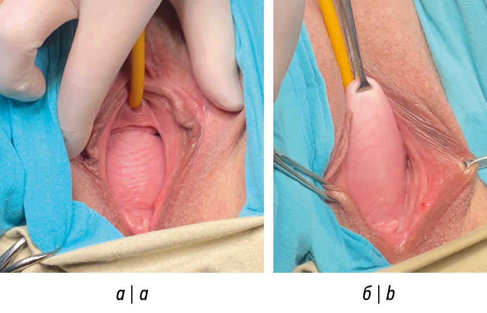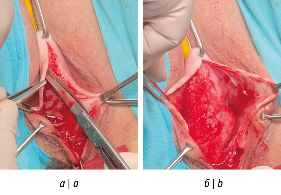 Step 1. A Foley catheter was inserted into the bladder under aseptic conditions. After preliminary hydropreparation, the vaginal wall above the enterocele was fixed with clamps (Figure 1, a, b) and the vaginal mucosa was dissected longitudinally to the peritoneum without damaging the latter. The hernia sac was then dissected down to its orifice (Figure 2, a, b). Surgical landmarks included the level of the cervix (subgroups B, C) or the cervical stump (subgroup A) anteriorly, the level of the coccyx posteriorly, and the level of the sciatic spines at the left and right sides. During dissection, the hernia sac was carefully separated from the anterior wall of the rectum. After emptying the hernia sac, a non-absorbable purse-string suture was placed at the sac orifice.
