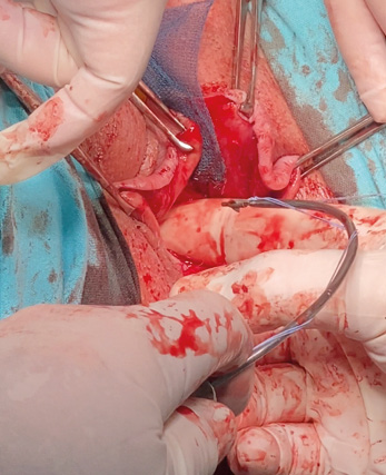 Step 4. Colpoperineorrhaphy with levator plasty was performed using the classical technique. An antiseptic tampon was inserted into the vagina. The duration of surgery ranged from 45 to 65 minutes with an average of 56.0±7.4 minutes. Blood loss ranged from 60 to 160 mL (87.0±15.6 mL).