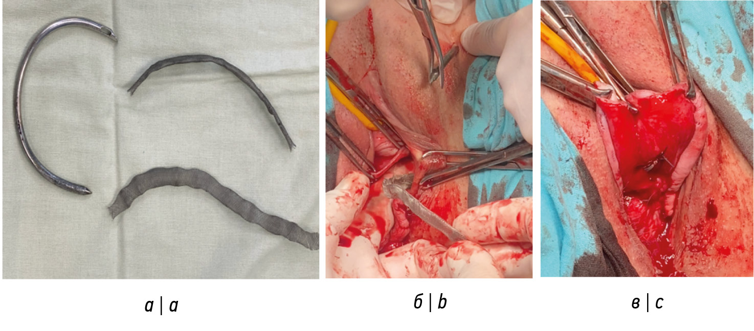 Fig. 4. Transobturator placement of tape-shaped titanium implants: а, tape-shaped titanium implants and impactor (needle); b, transobturator placement of tape-shaped titanium implants; с, consolidation of the proximal ends of tape-shaped mesh implants with the posterior cervical wall.