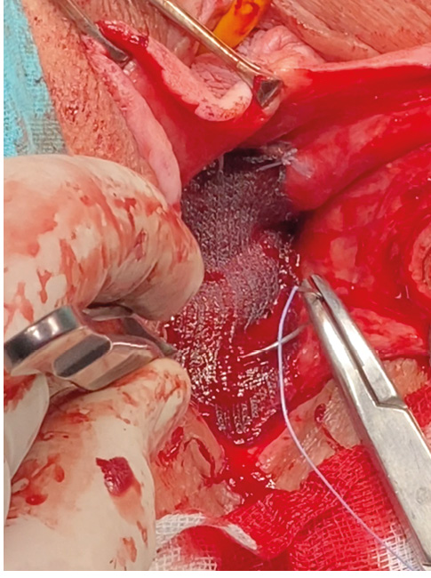 Fig. 5. Installation of a mesh implant “titanium silk” in the shape of a “spearhead.”
