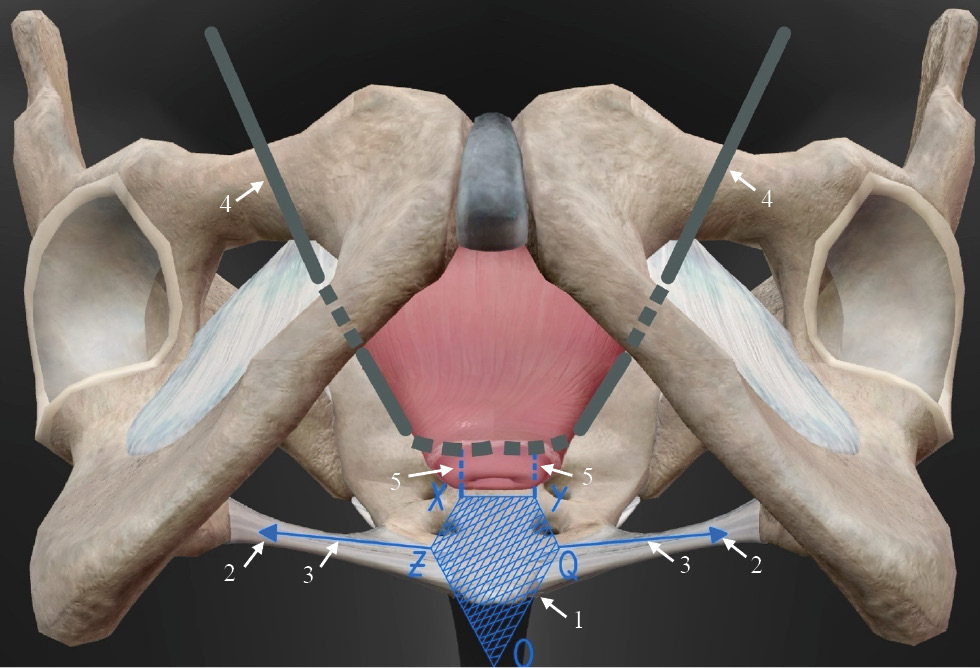 Step 3. Based on the individual morphometric parameters of each patient, a pentagonal flap in the shape of the tip of a spear was cut from the titanium silk fabric, with tip facing the entrance of the vagina (point O; Figure 5). The base of the spear as a platform with two almost right angles (points X, Y) was sutured to the posterior lip of the cervix at the level of the titanium band. The lateral parts of the spear in the area of obtuse angles (points Z, Q) were sutured with non-absorbable ligatures secured in anchors fixed in the sacrospinal ligaments. Additional sutures were placed to the lateral surfaces and the tip of the ”spear” (point O) with non-absorbable ligatures, providing multifocal fixation to the underlying tissues (Figure 6).