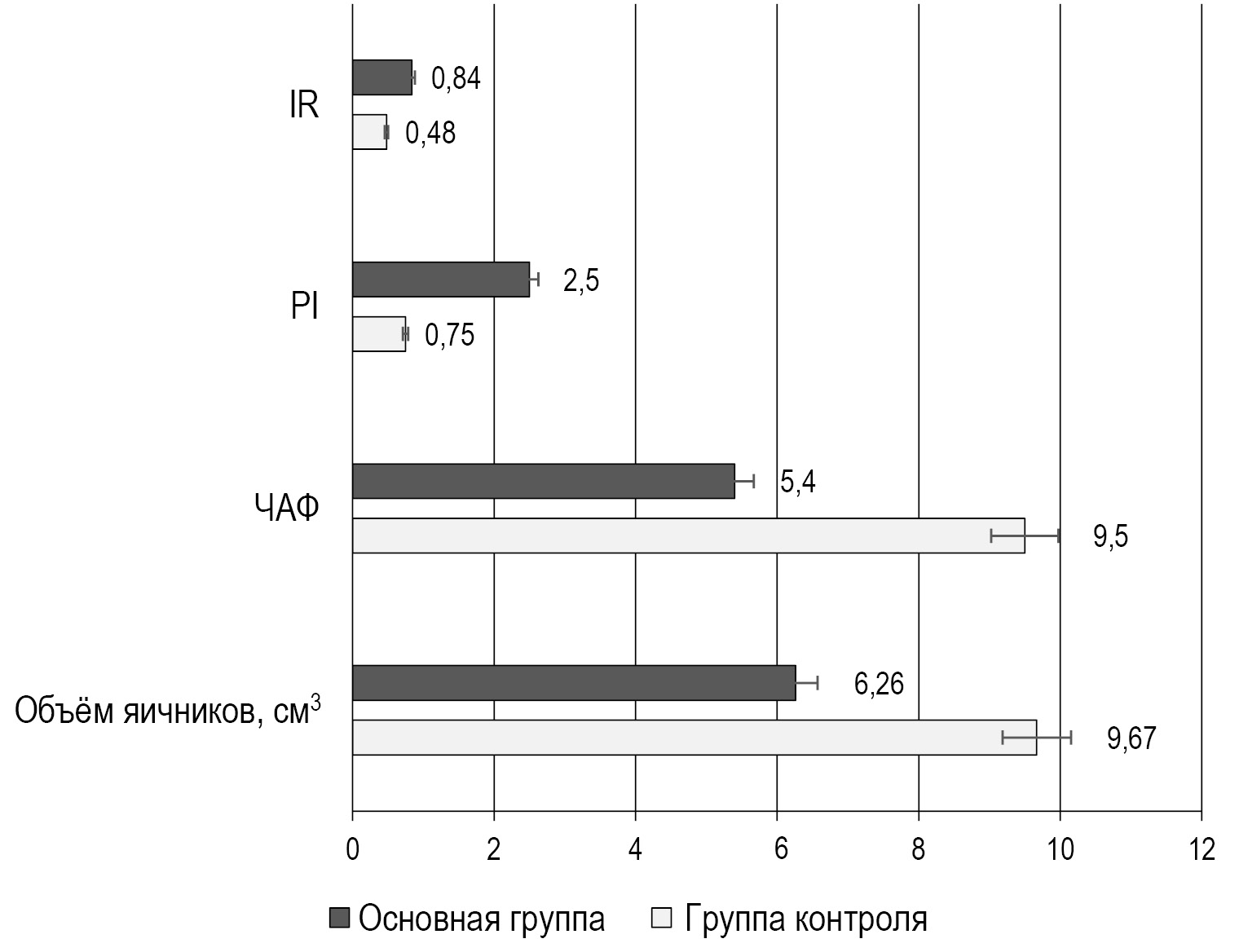 To evaluate blood circulation in the ovarian arteries, angle-independent indices that characterize peripheral vascular resistance (pulsation index PI and resistance index IR) were assessed.