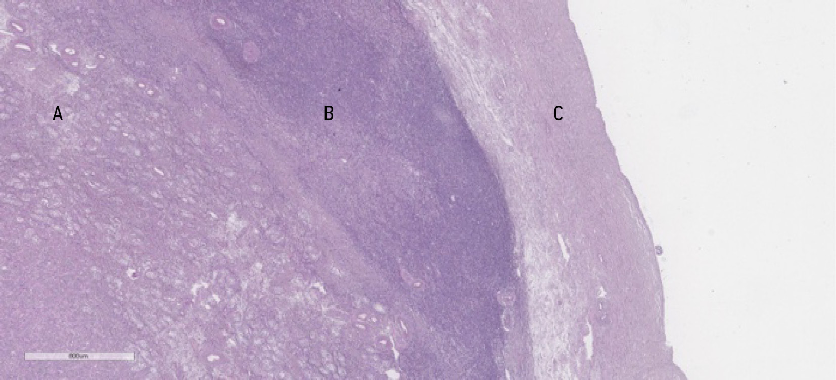 Fig. 2. Right uterine adnexa. Fragments of the ovotestis composed predominantly of testicular tissue (A) with a lobulated structure and ovarian stroma (B), enclosed within a thick tunica albuginea (C). Hematoxylin and eosin staining, ×800