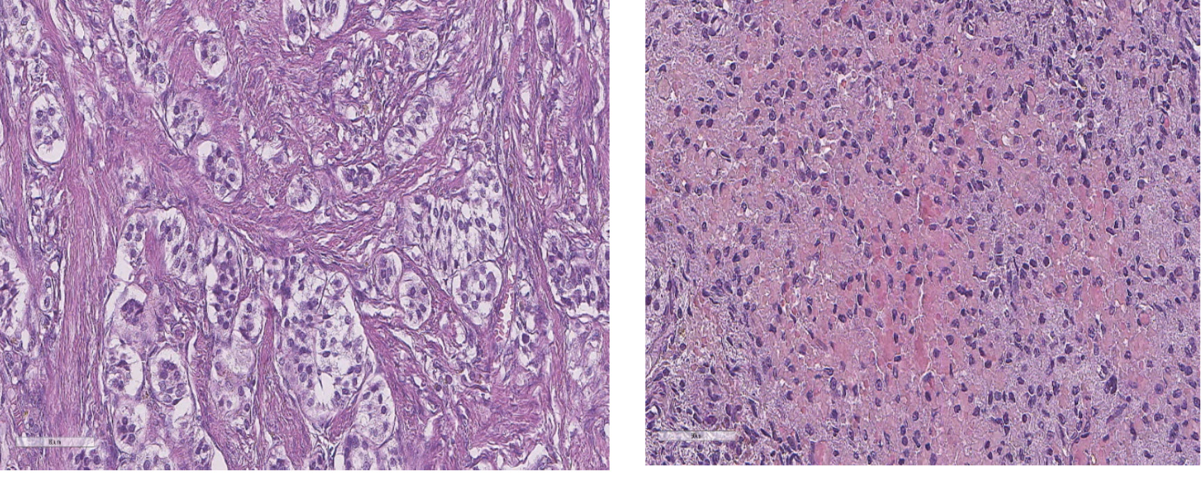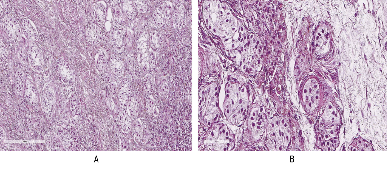 Fig. 8. Testicular component of the ovotestis, composed of seminiferous tubules lined with Sertoli cells without atypia and without spermatogenesis (A), surrounded by Leydig cells (B). Hematoxylin and eosin staining, ×200, ×60