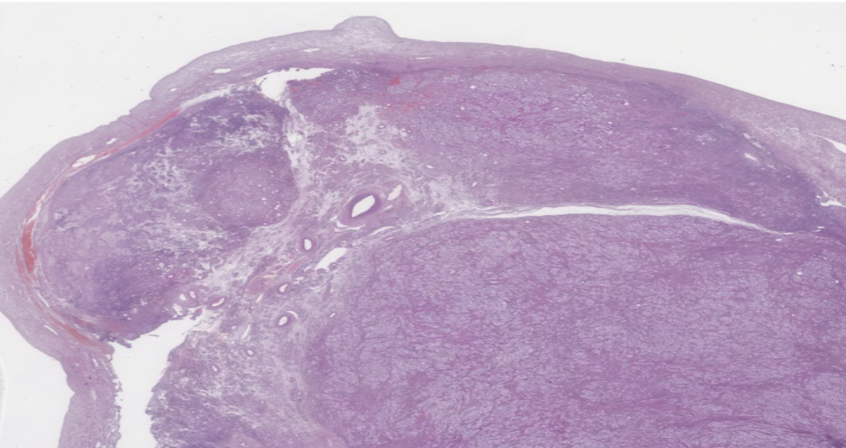 Fig. 6. Left uterine adnexa. Fragments of the ovotestis consisting predominantly of lobulated testicular tissue and ovarian stroma, enclosed within a thick tunica albuginea. Hematoxylin and eosin staining, ×6
