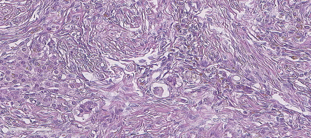 Fig. 4. Testicular component of the ovotestis, composed of seminiferous tubules lined with Sertoli cells without atypia and without spermatogenesis, along with areas of Leydig cells. Hematoxylin and eosin staining, ×60