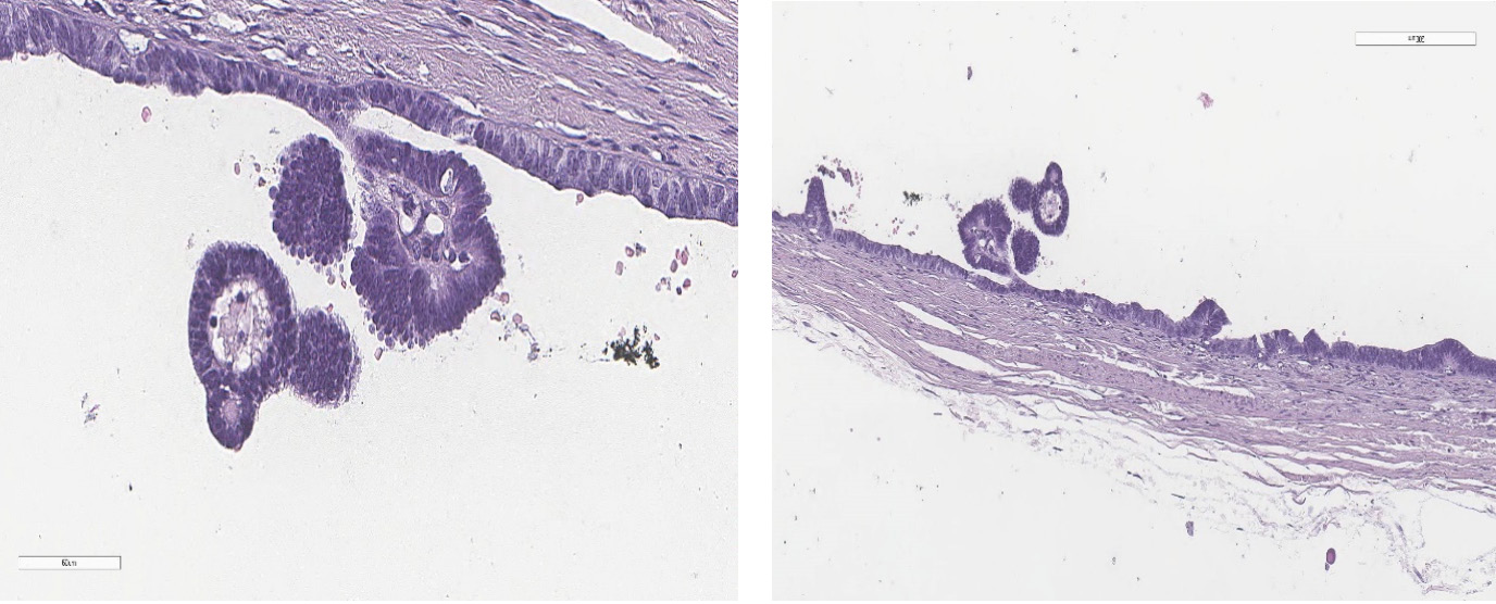 Fig. 9. Left fallopian tube with features of hypoplasia, presenting as a cystic structure lined by a single-layered tubal epithelium with occasional epithelial projections. Hematoxylin and eosin staining, ×200, ×60