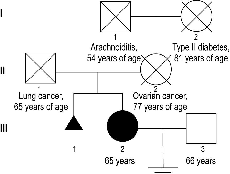 Genetic counseling (Fig. 1) revealed that the proband’s mother had experienced a spontaneous early miscarriage during her first pregnancy. The proband’s mother had been diagnosed with ovarian cancer and died at the age of 77 years, and the proband’s father had been diagnosed with lung cancer and died at the age of 65 years. According to the proband, the parents resided in a chemically polluted area. A review of the maternal family history revealed that the grandmother had type 2 diabetes mellitus and died at the age of 81 years, whereas the grandfather had arachnoiditis and died at the age of 54 years. The paternal family history was not documented.