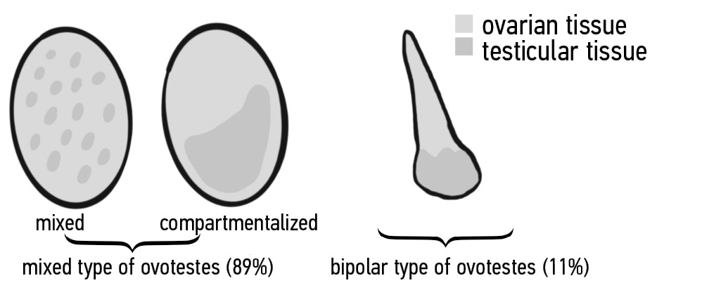 (2) compartmentalized type, in which the entire upper part of the gonad consists of ovarian tissue; the lower part consists of a cluster of testicular tissue;