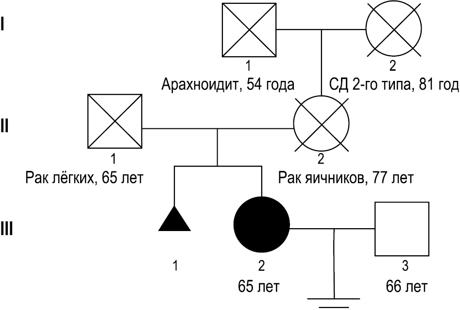 Консультация генетика (рис. 1): из семейного анамнеза известно, что первая беременность матери пробанда окончилась спонтанным выкидышем на раннем сроке. Мать пробанда страдала раком яичников, умерла в возрасте 77 лет, у отца пробанда был рак лёгких, умер в 65 лет. Со слов пробанда родители проживали в районе с химическими загрязнениями окружающей среды. Семейный анамнез по линии матери: у бабушки — сахарный диабет 2-го типа, умерла в 81 год, у дедушки — арахноидит, умер в 54 года. Семейный анамнез по линии отца неизвестен.