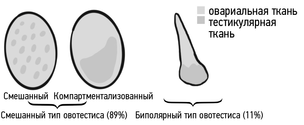 Существует несколько вариантов комбинаций и расположения овариальной и тестикулярной тканей: