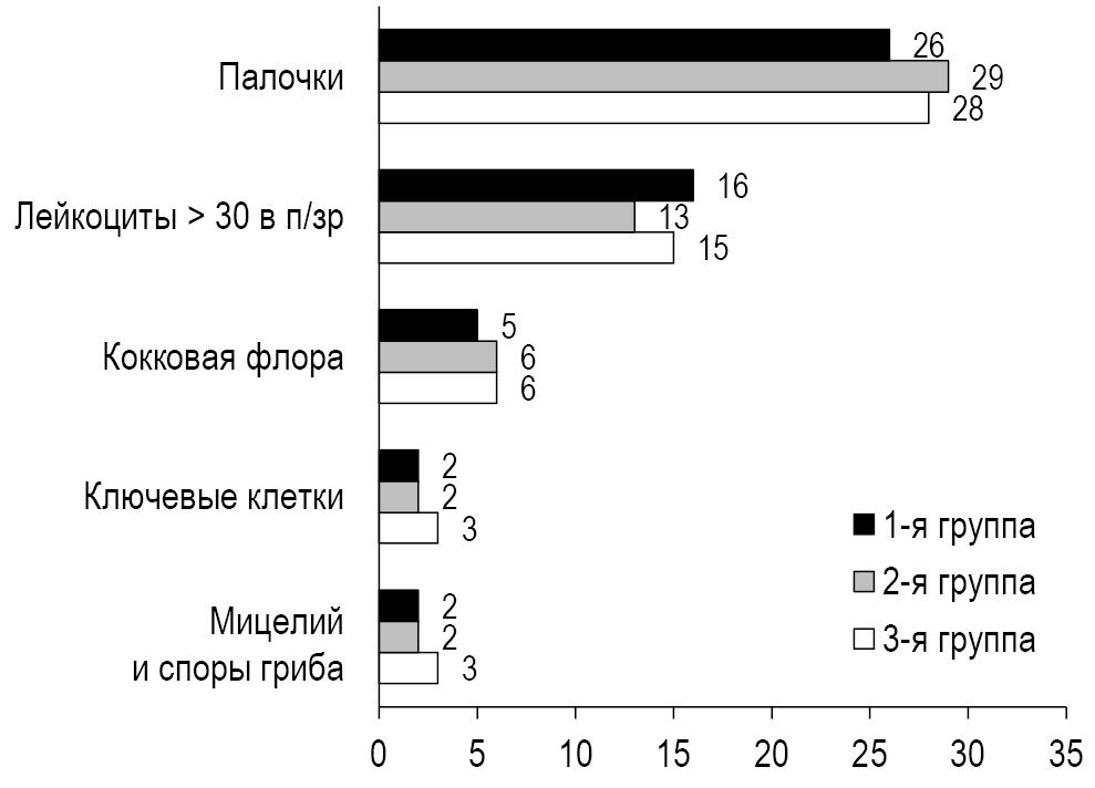 Как видно из данных рис. 1, в результате бактериоскопического исследования отделяемого половых путей статистически значимых различий между группами не было. Бациллярная флора обнаружена у 83 (56,8%) из 146 обследованных, причём в мазках присутствовали не только лактобактерии, но и другие виды палочек, включая E. coli. Повышенное количество лейкоцитов (более 30 в поле зрения) при осмотре мазков выявлено у 44 (30,1%) пациенток. Кокковая флора определена у 5 (10,4%), у 6 (13,3%) и у 6 (11,3%) пациенток 1-й, 2-й и 3-й групп соответственно (р >0,05). Мицелий и споры гриба Candida обнаружены у 2 (4,1%) женщин 1-й группы, у 2 (4,4%) — 2-й, у 3 (5,7%) — 3-й (р >0,05). Ключевые клетки обнаружены у 2 (4,1%), у 3 (6,7%) и у 2 (3,8%) пациенток 1-й, 2-й и 3-й групп соответственно (р >0,05).