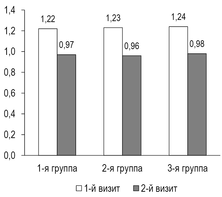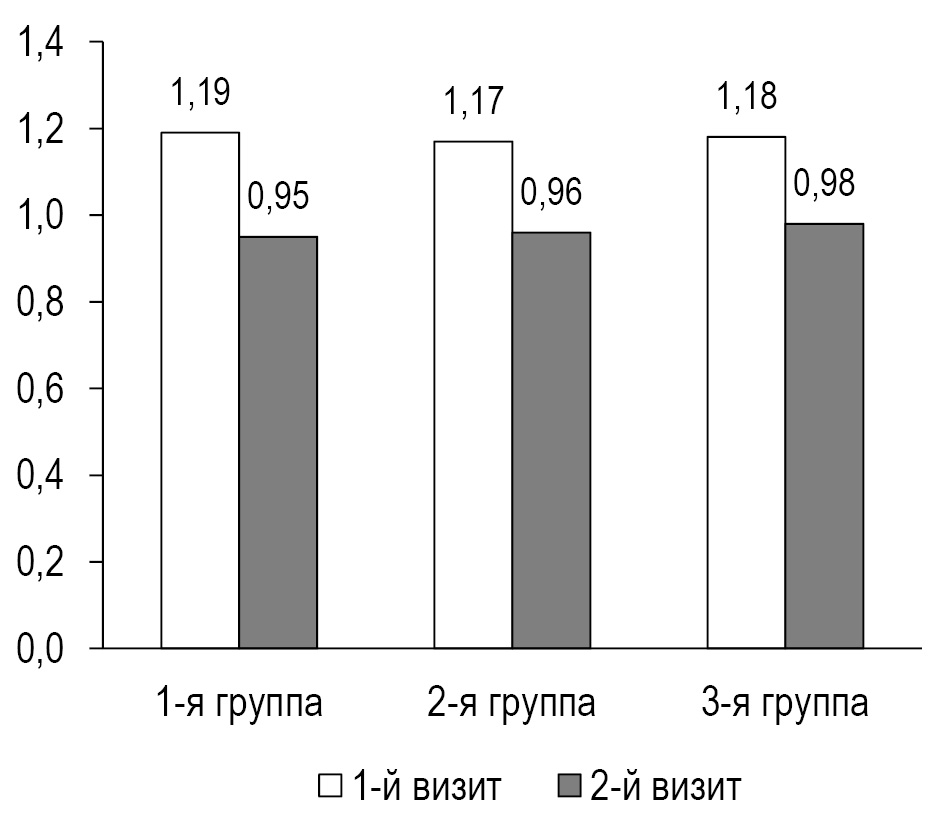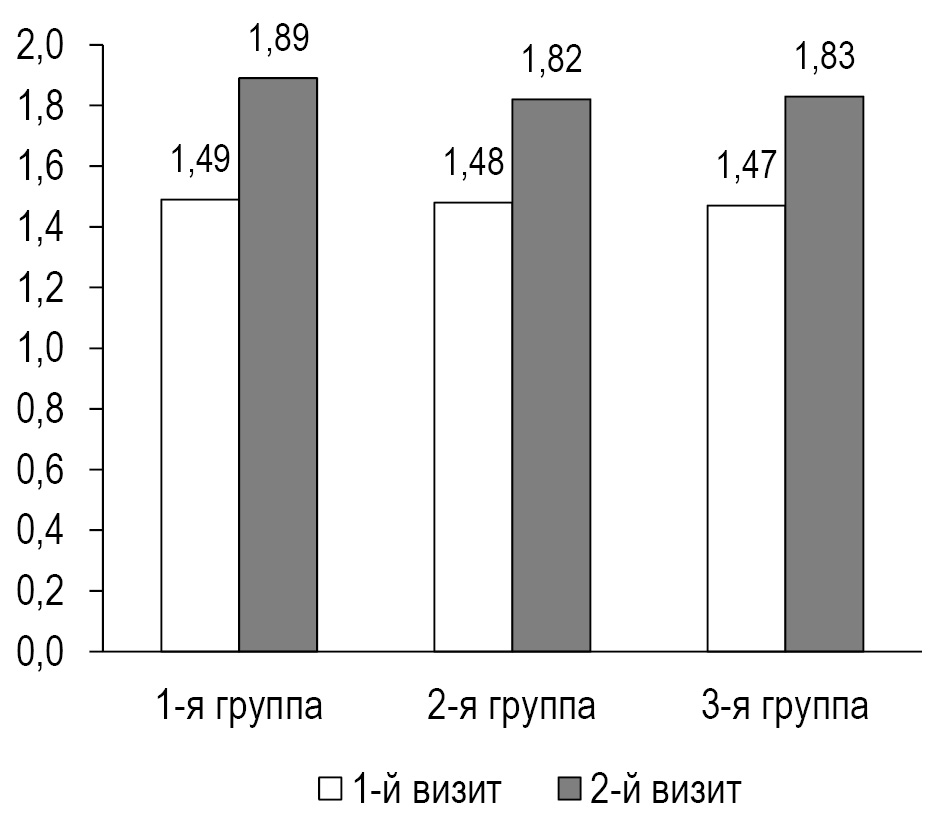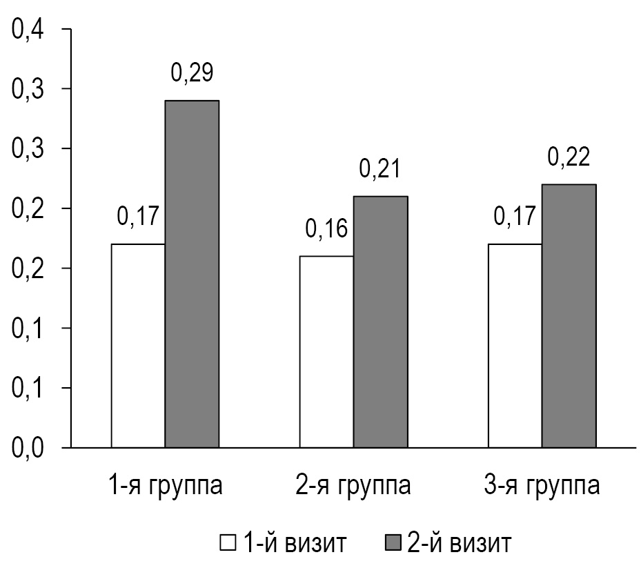 Представленные данные на рис. 4 демонстрируют статистически значимое (р <0,05) увеличение уровня супероксиддисмутазы у пациенток всех обследованных групп, по сравнению с первым визитом, причём более выраженным увеличение уровня фермента было в группе пациенток, получавших комплексную терапию: уровни супероксиддисмутазы увеличились на 21,1% (с 1,49±0,04 до 1,89±0,1 усл. ед.). Тогда как во 2-й группе увеличение супероксиддисмутазы составило 18,7% (с 1,48±0,04 до 1,82±0,05 усл. ед.), а в 3-й группе — 19,7% (с 1,47±0,2 до 1,83±0,3 усл. ед.).