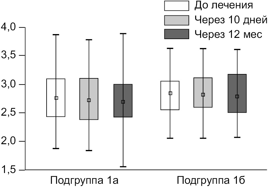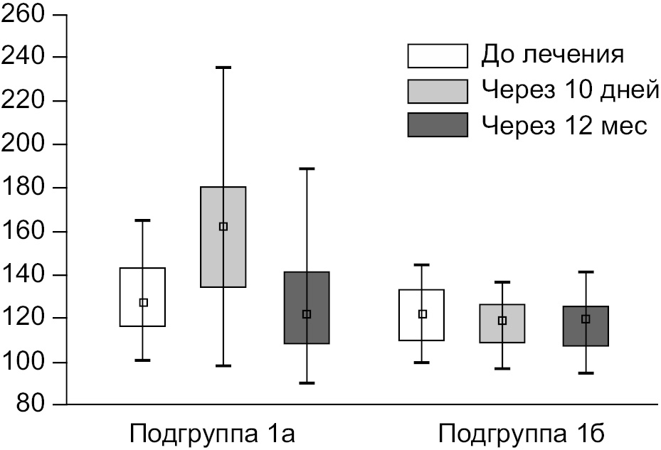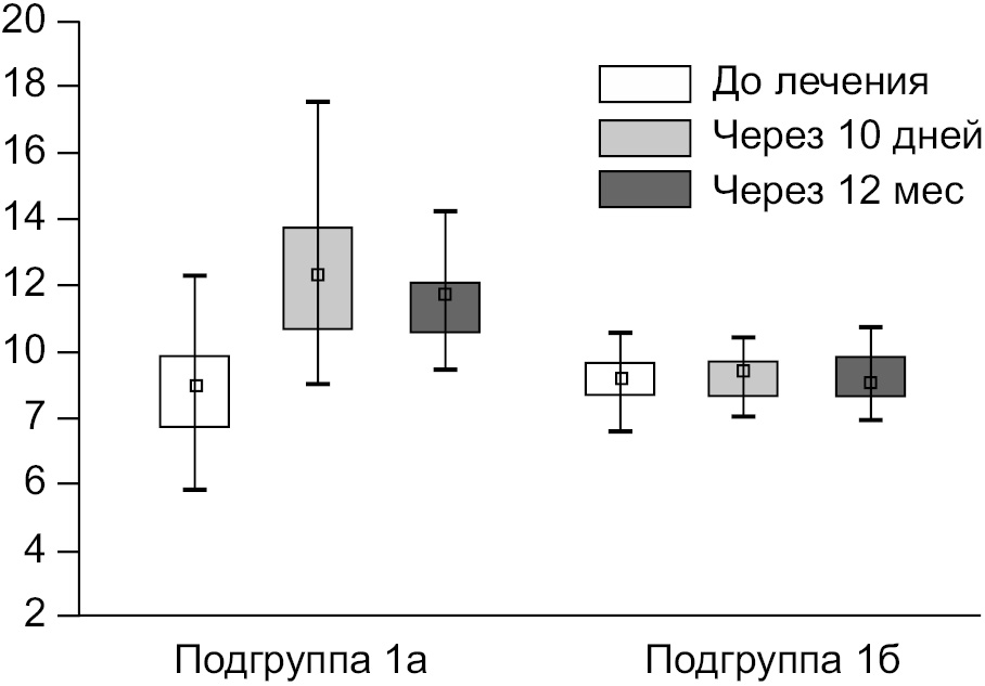 The symbol * indicates values that have significant differences with the control group (Mann–Whitney test, p <0.05); р1 ― significant difference in the parameters of subgroup 1a compared with subgroup 1b after 10 days (p <0.05); р2 ― significant difference in the indices of subgroup 1a compared with subgroup 1b after 12 months (p <0.05); р3 ― significant difference in the indices of subgroup 1a compared with values before treatment (p <0.05); р4 ― significant difference in the indices of subgroup 1b with values before treatment (p <0.05).
