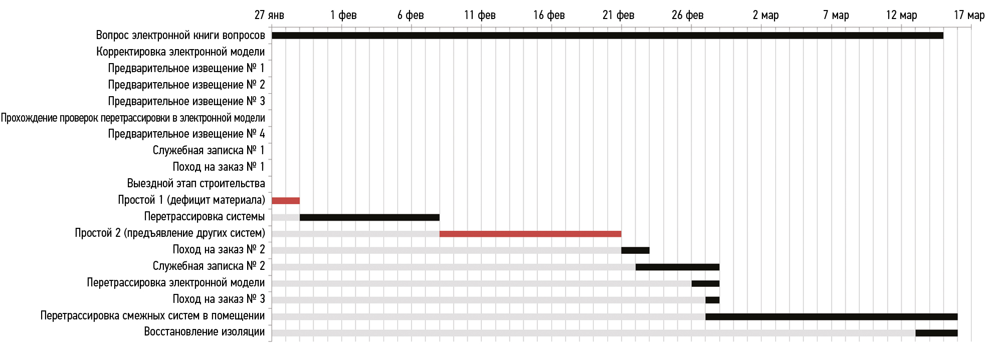 В табл. 1 отображена хронология действий со стороны мастеров, отвечающих за монтаж системы, инженерного центра, службы технологов, отдела строителей, отдела «ЭРА» (ЭлектроРадиоАвтоматика) и проектного бюро. Для более точного исследования была использована информационная площадка связи завода-строителя с проектным бюро ― Электронная книга вопросов.