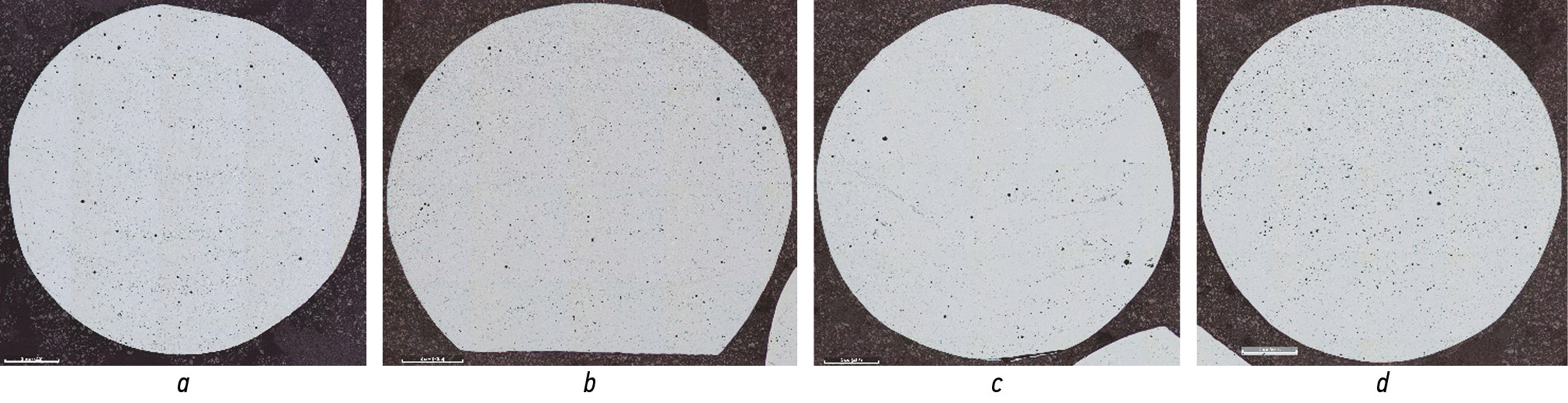 Рис. 5. Макрошлифы: a ― линейные колебания перпендикулярно направлению выращивания (пористость 0,93 %); b ― эллиптические колебания вдоль направления выращивания (пористость 0,98 %); c ― линейные колебания под углом 45 градусов относительно направления выращивания (пористость 0,88 %); d ― змейка (пористость 0,90 %).