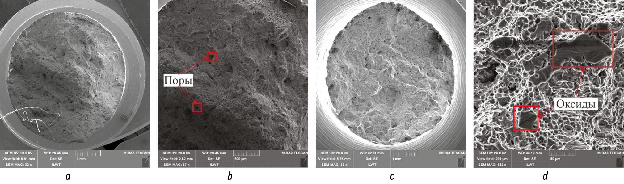 На втором образце в направлении оси Z наблюдается просадка на 10,2 % по пределу прочности и на 7,5 % по относительному удлинению в сравнении со значением по ГОСТ. Также наблюдается значительный уровень анизотропии по прочности ― до 13 %. Анализ изломов показал, что разрушение образцов происходило по вязкому механизму. В обоих направлениях на изломах наблюдаются поры, в направлении оси Z наблюдаются области, обогащенные оксидом, за счет чего происходит охрупчивание материала и более раннее разрушение образца (рис. 7).