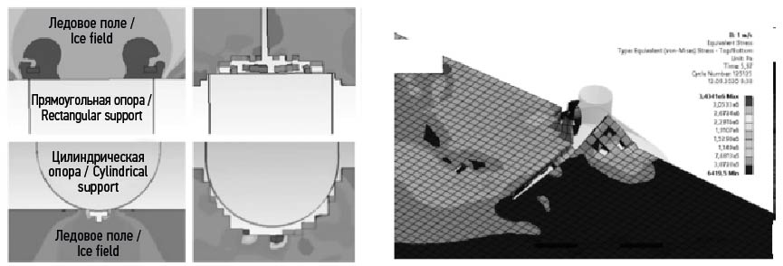 5. Рис. 4. Численное моделирование взаимодействия опорной колонны с ровным ледовым полем методом SPH, по материалам работы [14].