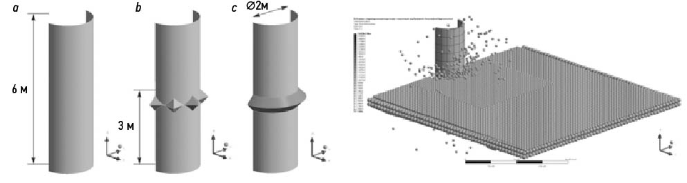 Как следует из названия, SPH широко применяется в вычислительной гидродинамике, однако в настоящее время активно ведутся работы по адаптации метода для МДТТ, в первую очередь применительно к задачам хрупкого разрушения [11, 12]. Метод позволяет моделировать развитые деформации и разрушения среды путем разделения скопления частиц. В [13] представлены решения задач хрупкого разрушения образцов льда при изгибе и сжатии, а также выполнено прогрессирующее разрушение ледяной балки о препятствие и разрушение равномерного ледяного покрова при прохождении судна с разными скоростями (без учета водной среды). В работе [14] выполнено численное моделирование взаимодействия цилиндрической колонны (гладкой, с цилиндрическими и кольцевой наделками) с ровным ледовым полем в SPH-постановке (см. рис 4).