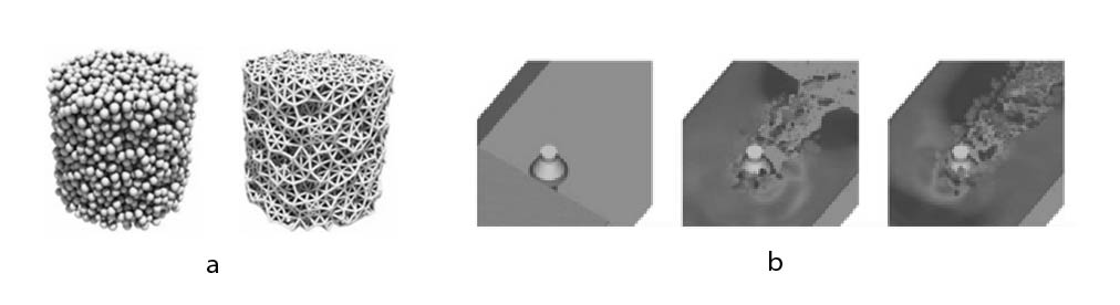 Рис. 6. Численное моделирование методов дискретных элементов: a — дискретные элементы и визуализация балочных связей между ними [23]; b — моделирование массивных льдин, воздействующих на опоры шельфовых установок [28].