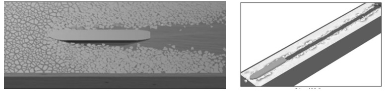 1. использование технологии удаления отдельных разрушенных элементов (Element Erosion Technique, EET), обладающей целом рядом упрощений и допущений. В EET ледовое поле моделируется как сплошное тело, для которого задаются законы деформирования и критерии разрушения. Разрушенные элементы удаляются из модели и не участвуют в последующем процессе взаимодействия, что, очевидно, приводит к нарушению законов сохранения и не может восприниматься как надежный метод для расчета параметров ледового воздействия на конструкцию. Графический пример расчетов с применением технологии удаления разрушенных элементов (EET) представлен на рис. 1 [1, 2].