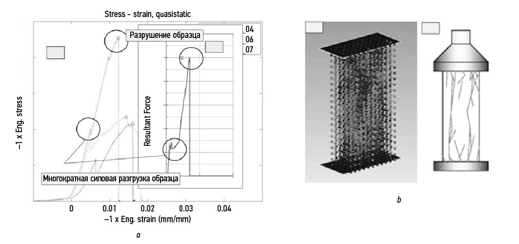 Fig. 9. Numerical modeling of quasi-static uniaxial compression tests (v=1 cm/s): a, deformation curves (brittle zone); b, typical pattern of damage propagation based on materials from [35, 36]. SPG method.