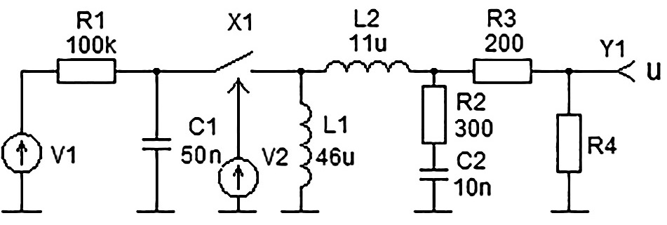 Генератор микросекундных импульсных помех длительностью 50 мкс по ГОСТ IEC 61000-4-5-2017 моделируется схемой, представленной на рис. 3.