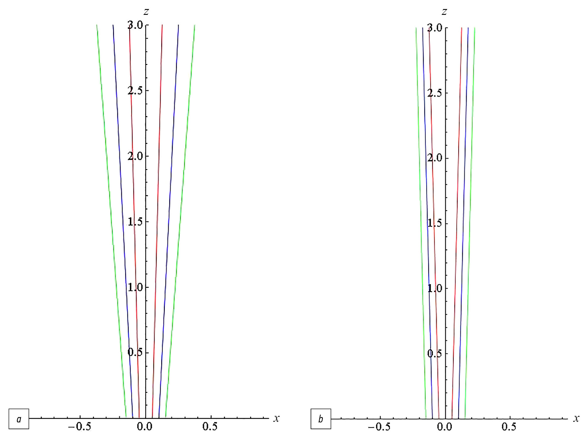 На рис. 2, а показаны траектории частиц с разными начальными значениями поперечной координаты x~1: ±0,15 — зеленые линии, ±0,1 — синие линии, ±0,05 — красные линии. Начальные скорости частиц совпадают со скоростью самого потока на выходе из трубочки — vt=0=ux~1, z~1=0ux~1, ux~1=±0.05=0.012, 0.499, ux~1=±0.1=0.024, 0.497, ux~1=±0.15=0.036, 0.494.