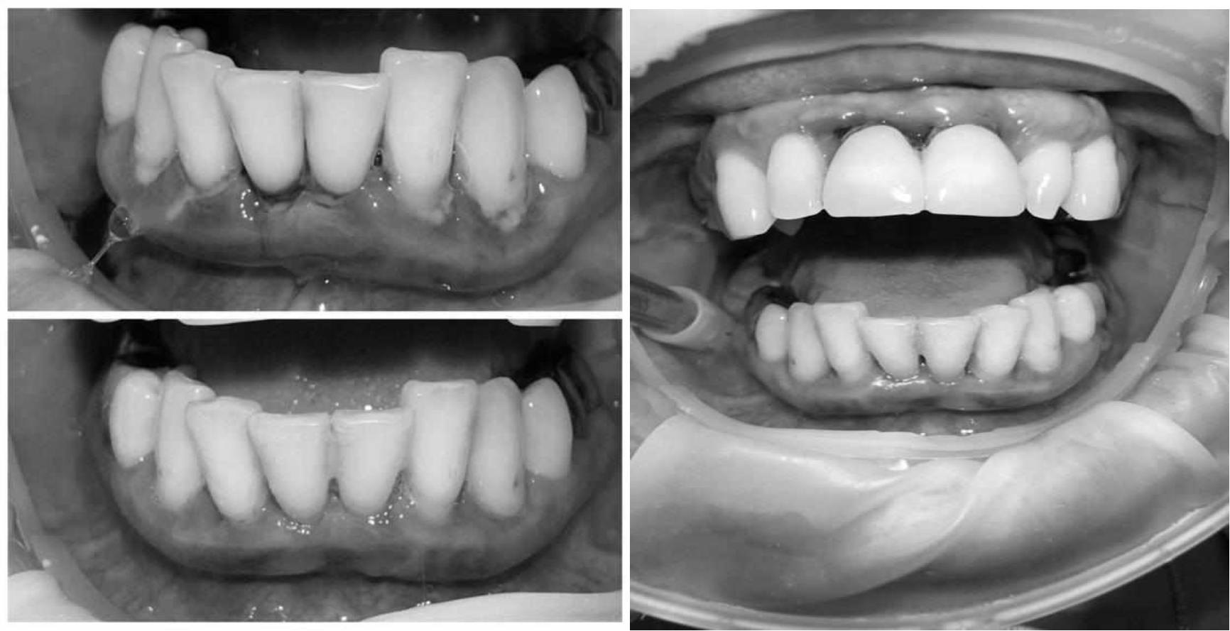 В качестве поддерживающего пародонтологического лечения проводилась обработка поверхности корней с применением аппарата «Вектор», диодного лазера. Для домашнего использования были подобраны ополаскиватели с содержанием хлоргексидина, рекомендованы аппликации противовоспалительных стоматологических гелей. После снятия воспалительных явлений пародонта провели шинирование 4.3, 4.2, 4.1, 3.1, 3.2, 3.3 зубов с применением стекловолоконной ленты. Контроль лечения проводился через 1, 3 и 6 месяцев.